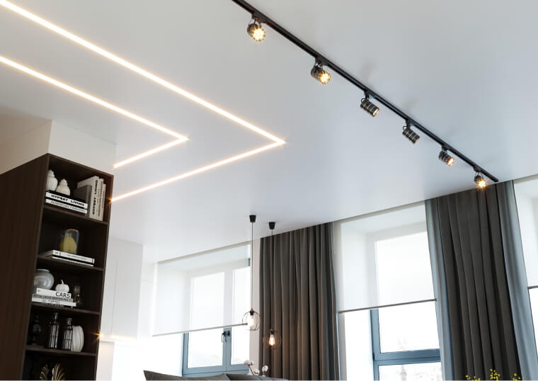 • Между поверхностью потолка и пленкой можно прокладывать электрическую проводку. Также вы легко замаскируете разводку труб, так что внешний вид интерьера не пострадает.