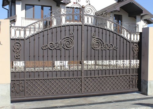 Большое разнообразие форм и дизайнов позволяет подобрать вариант, полностью удовлетворяющий индивидуальным предпочтениям. При необходимости откатные кованые ворота оборудуются удобной калиткой, а для улучшения их привлекательности, в конструкции могут использоваться элементы из элитной древесины ценных пород и цветного стекла.