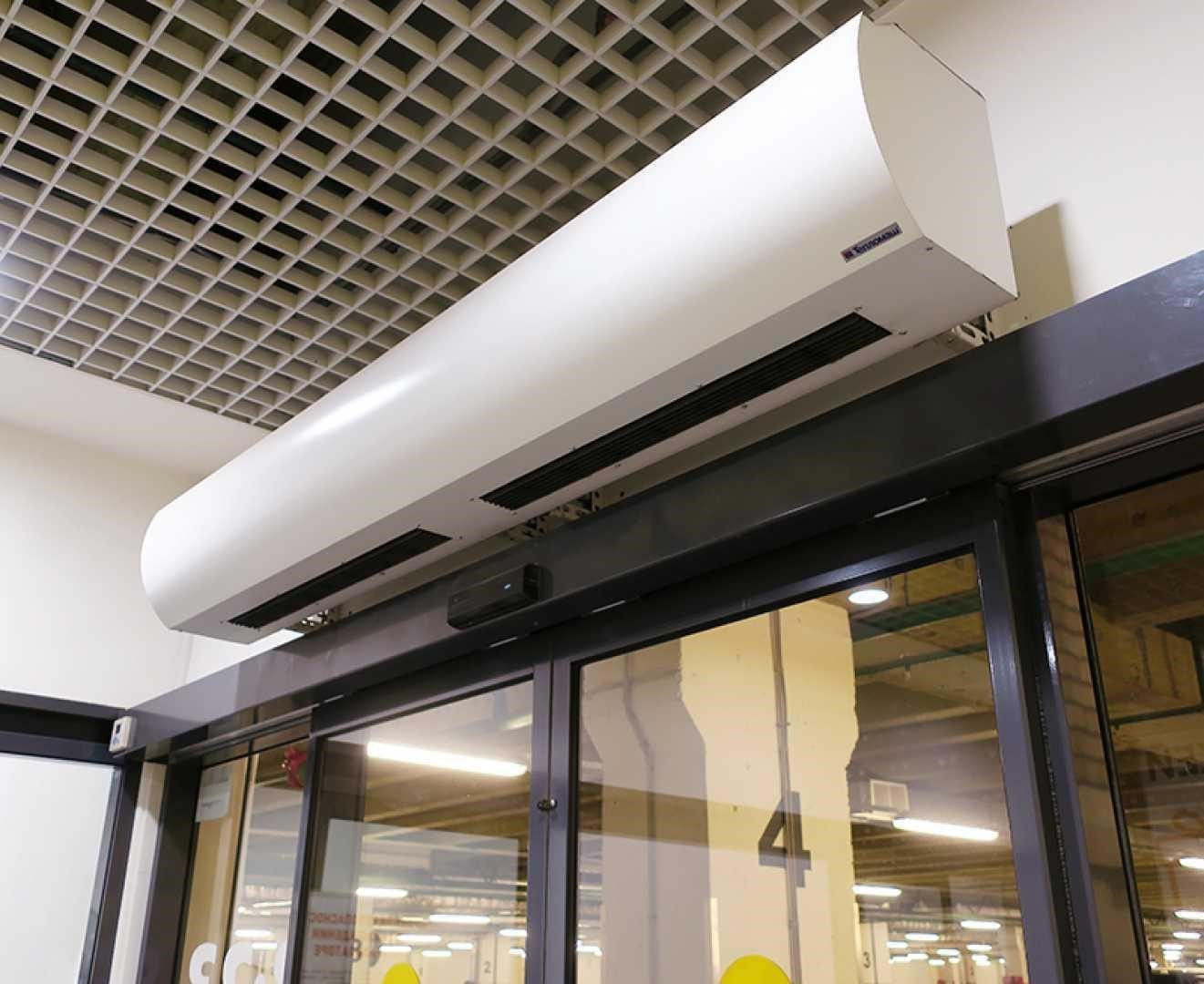 Тепловая завеса представляет собой мощный тепловентилятор, монтаж которого осуществляется во входном проеме. Устройство подает поток нагретого воздуха, не давая тем самым проникнуть в помещение холодному воздуху извне.