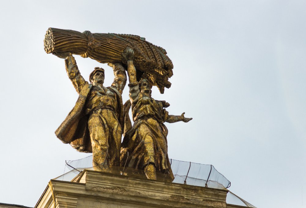 Напомним, что эту скульптуру "Тракторист и колхозница" установили на 20-метровом постаменте на Всесоюзной сельскохозяйственной выставке ещё в далеком 1939 году. Во время обновления выставки после войны в 1954 году башня была демонтирована, а композицию поставили на арке главного входа.