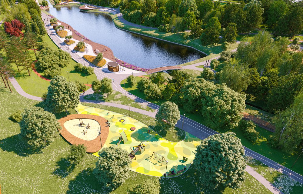 В частности, у воды установят деревянные настилы и спуски к прудам, где посетители парка смогут отдыхать. Для прогулок создадут сеть дорожек, одна из которых будет поделена специальной линией на велосипедную и пешеходную зоны.